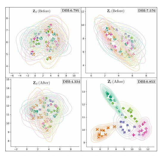 作者对两个变分变量的方法进行了可视化处理,证明确实可以让特征更加可分,Zl的区分度明显提高。