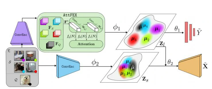 背景:人类具备从极少样本中快速学习的能力,而深度学习通常需要海量数据才能达到良好性能。为应对样本匮乏的问题,少样本分类(Few-Shot Classification)成为研究热点。作者提出了一种将图像表示解耦为语义潜变量和标签潜变量的方法,同时设计了基于注意力的AttFEX模块,来捕捉跨样本的特征。