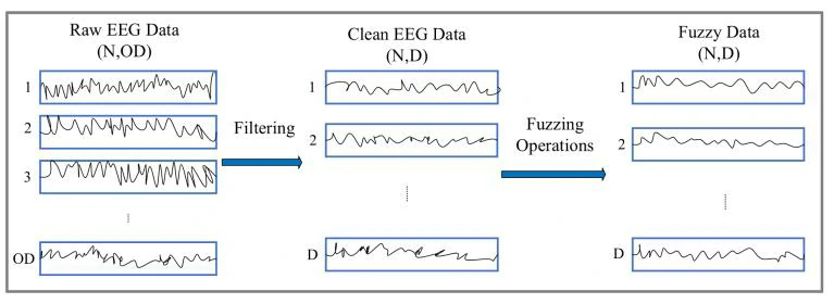 图1 EEG处理。预处理是一个包含滤波和模糊化两个步骤的过程,目标是尽可能去除伪迹并将数据转换为模糊属性。其中,N表示输入样本的数量,OD表示原始特征的维度,D表示处理后的特征维度,且D≤OD。