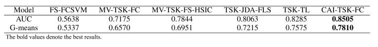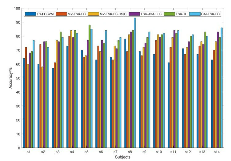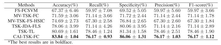 可以看出,CAI-TSK-FC模型具有优越的分类性能。与次优方法相比,CAI-TSK-FC在自制数据集和SEED-VIG公开数据集上的准确率分别提高了3.15%和1.52%。这表明CAI-TSK-FC具有较高的识别性能,主要原因如下: