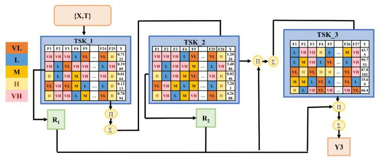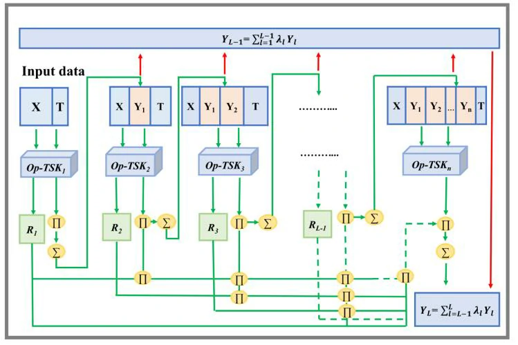 在CAI-TSK-FC中,训练从零阶子分类器Op-TSK₁开始,它以原始数据作为输入。初始假设是Op-TSK₁仅包含五条模糊规则,其输出为Y₁,这与后续高层子分类器不同。接下来,CAI-TSK-FC将输入提供给下一个TSK子分类器。当第一层的TSK子分类器未能达到预期结果时,CAI-TSK-FC将使用当前层的输入和输出来形成下一层的输入,并随机选择当前层的一条模糊规则来计算下一层的模糊规则。此时,输入为(X, Y1) ∈ Rd+1。如果第l层的TSK子分类器未能达到所需的性能,则CAI-TSK-FC将继续训练第l + 1层的数据,并重复该过程,直到在第L层获得预期结果。