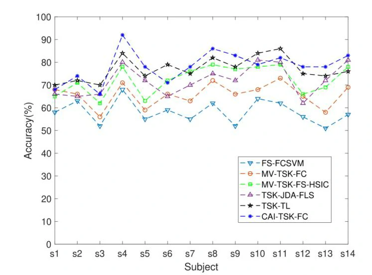 本文的实验基于SEED-VIG公开数据集和自制数据集。本研究将CAI-TSK-FC与其他五种基于EEG的TSK模糊系统分类器进行了比较,包括FS-FCSVM、MV-TSKFC、MV-TSK-FS-HSIC、TSK-JDA-FLS和TSK-TL。在所有TSK模糊系统模型中将模糊规则的数量设置为5,并将层数的初始值设置为3。
