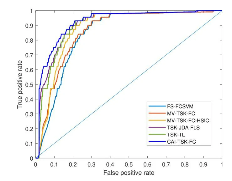 例如,在图9中,第二层的FRM第一条模糊规则显示,第一条模糊规则中的第一个和第二个特征采用高斯隶属函数中的非常高(VH)。第26个特征采用高斯隶属函数中的高(H)。同样,第二条、第三条、第四条和第五条模糊规则也可以进行解释。根据上述内容,可以看到CAI-TSK-FC具有良好的可解释性。