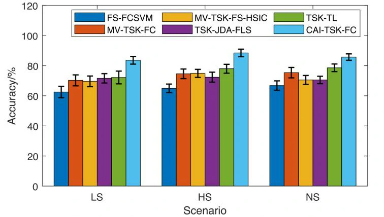 本研究的方法的分类效果优于其他任何方法。根据图8可以看到,在LS场景下的准确率略低于其他两种场景。这可能是由于受试者在开放道路场景下的疲劳程度较低,且其数据集的不平衡性较为明显,导致模型学习资源不足。然而,本研究提出的CAI-TSK-FC仍然表现良好,这表明本研究采用的深度集成结构能够缓解这一问题。
