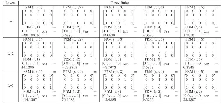 其中,F1、F2和F25表示原始数据集的特征,F26表示前一层的输出特征。当把输入特征划分为五个模糊子集时,它们的语义可以解释为非常低(VL)、低(L)、中等(M)、高(H)和非常高(VH)。每一行都可以转换为具有非线性部分的模糊规则。例如,根据公式(7),第二层的五条模糊规则如表6所示。