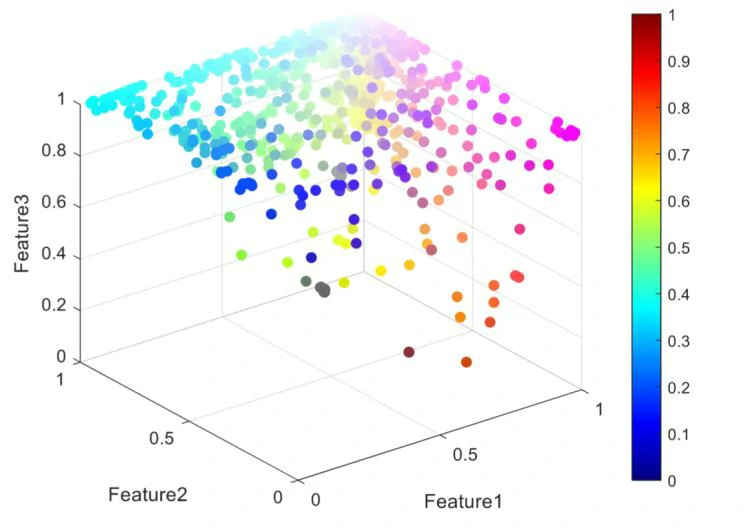 此外,本研究还可视化了模糊隶属矩阵特征的前三个特征,如图10所示。在模糊隶属矩阵特征的可视化中,三个特征分别表示为x轴、y轴和z轴。根据这三个特征的值,确定每个样本在3-D空间中的位置。例如,如果一个样本在特征1上值较高,在特征2上值较低,在特征3上值中等,则其在3-D图中的位置可能更靠近x轴的顶部、y轴的底部和z轴的中部。这个3-D图解释了基于这三个特征的样本分布。还可以根据点的颜色和大小确定样本在模糊集合中的隶属度,红色表示值为1,蓝色表示值为0。样本点在特征上的值越大,其对结果的影响就越大。