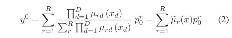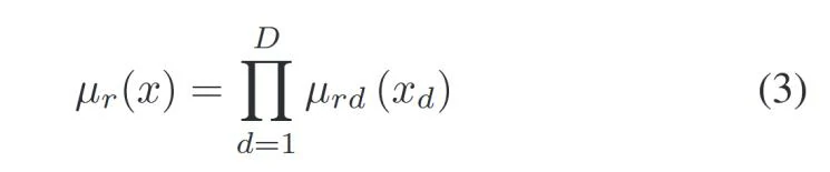 其中,μrd(xd)是通过高斯隶属函数计算的模糊规则的结果,μr(x)是通过模糊规则标准化后的模糊隶属函数,μr(x)是通过模糊规则的前件部分经过模糊化运算得到的,即: