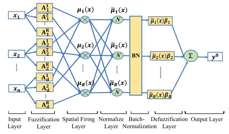 - 空间激发层:这一层的主要功能是计算空间激发强度。基于前一层的函数计算,可以获得输入数据每个特征的隶属度值。传统的空间激发强度是通过连续累积乘法方法计算的。这种方法受到维度诅咒的影响,无法适应高维数据,公式如下: