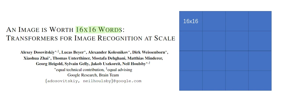 首先是论文标题,论文标题的意思是:一张图片等价于很多 16 × 16 的单词,Transformer 用于大规模图像识别 。16 × 16 是指将一张图片划分成若干个块(patch),每一个 patch 大小为 16 × 16。这样一张图片就可以看作是若干个 patch 组成。这篇论文的作者还是蛮多的,有12个作者,可以看出这篇论文工作量确实很大,论文作者全部来自于 Google。