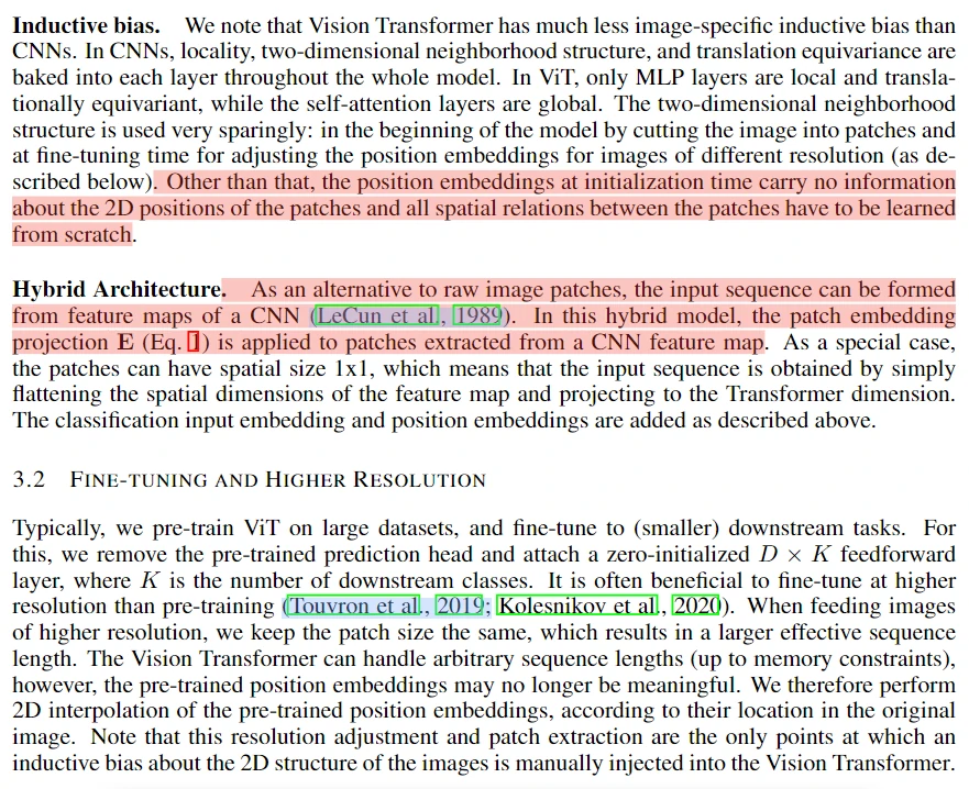 下面是归纳偏置介绍,主要是所有 patch 的空间关系都需要从头去学;另一个是将注意力机制和 CNN 特征图结合起来一起使用,构建混合模型,最后是微调模型以及对大尺度图片的处理。