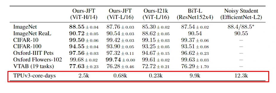 第一个实验结果是作者分别将 ViT 模型在不同的数据集上去预训练,然后在基准数据集上去比较,虽然从表中看到 ViT-H/14 比卷积模型 BiT-L 准确率高得并不多,但是从训练天数可以看到,ViT-H/14 需要的训练天数是 BiTL-L 的 1/4 左右,训练代价更小。