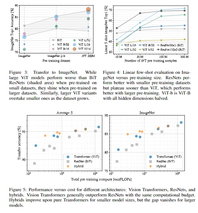 图3、4 表明随着预训练数据集的增大,Transformer 的效果会渐渐好于 ResNet,这表明 Transformer 有很好的可扩展性。图5表示,在同样运算能力下,Transformer 的效果也是好于 ResNet。