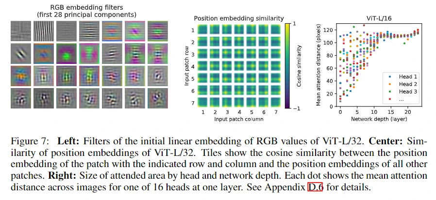 下面是一些可视化结果,中间这张图可以看到虽然本文使用的是 1D 的位置编码,但是网络仍然能学到不同 patch 位置间关系;右边这张图则表示 Transformer 学习能力,可以看到随着网络越深,获取全局信息能力越强。