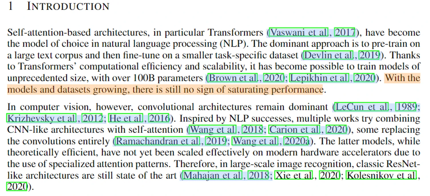 引言前两段主要是交代故事背景,在自然语言处理任务上,通常会在大的训练集上去训练 Transformer,然后在小的特定任务数据集上去微调。目前可以训练含有上千亿参数的 Transformer 模型,且随着模型和数据集的增加,并没有出现饱和现象。在计算机视觉领域,卷积神经网络仍然占据主导。最近一些新的研究,有的将自注意力机制和卷积神经网络结合起来训练(即在较小的特征图上使用自注意力机制),这是一种减少序列长度的方法;还有的是使用局部图片作为输入,然后使用 Transformer,也有论文研究分别在图像高度或宽度上使用 Transformer,这些都是为了减少序列长度。但以上方法都存在不足,都是针对特定任务来使用,在大规模图像识别数据集, 像 ResNet 这样的网络仍然是主流。