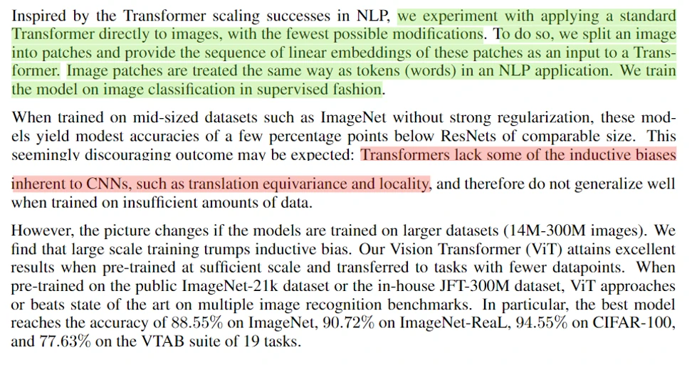 紧接着作者指出,Transformer 与卷积神经网络相比缺少归纳偏置,例如相关性(locality)和平移不变性(translation equivariance)。因此为了得到更好的结果,需要有足够多的训练数据,最后一段就是介绍模型效果,果然效果拔群。