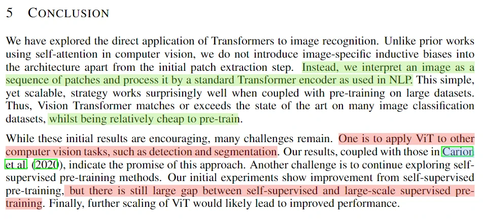 下面是论文结论部分。第一段总结本文做的工作,图片处理成 patch 序列,然后使用 Transformer 去处理,取得了接近或超过卷积神经网络的结果,同时训练起来也更便宜。第二段是未来展望: