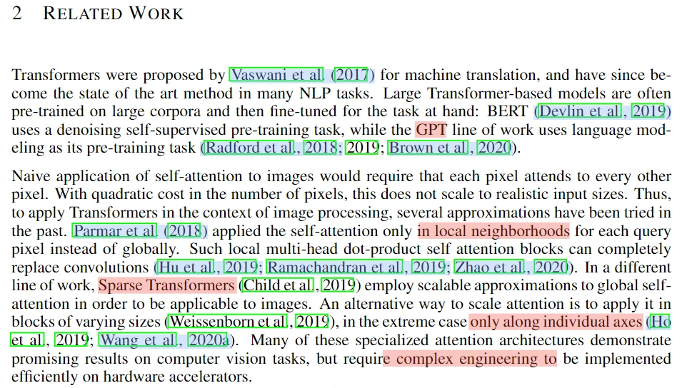 下面是相关工作,总共有6段。第1段说2017年 Transformer 被提出来以后,已经成为许多 NLP 任务最先进的方法,代表性的工作有 BERT(完形填空去预测缺少的词)和 GPT(语言模型,预测下一个词)。第2段是说,将自注意力用于图像处理,需要每个像素和每个像素两两交互,复杂度与像素数量平方成正比。因此在图像处理中使用 Transformer 需要做一些近似处理,包括在局部图像块用自注意力、使用稀疏的 Transformer 以及在轴上使用注意力,这些方法都取得了很好的效果,但是需要复杂的工程能力去实现硬件加速。