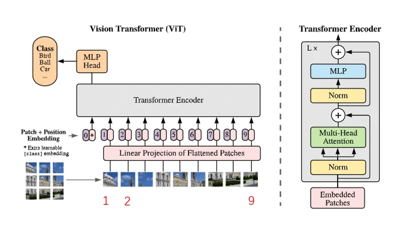 下面是ViT模型介绍,模型总览图如下图所示。输入为一张图片,将图片划分成9个patch,划分后的 patch 序列经过线性投射层变换得到 patch embedding ,与此同时对这些 patch 还添加了 position embedding,这样每一个 token 既包括图像信息又包括了位置信息。这里作者还借鉴了 BERT,添加了 class embedding,也包括位置信息,最终将这些 token 输入到 Transformer,最后 class embedding 对应的输出经过 MLP Head 进行类别判断,整个模型包括 L 个 Transformer。