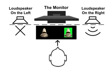 如图1所示。听觉刺激由放置在患者左前方及右前方的扬声器传达,会播放录制好的铃声。而视觉刺激由放置在患者正前方的显示器传达,显示器左右半边各有一个铃铛图标。视觉刺激时铃铛图标会有明显闪烁,而听觉刺激仅会在目标刺激的方位出现。所以目标刺激为(以右目标刺激为例):右边扬声器传出铃响,显示器右边的铃铛图标闪烁;非目标刺激为:显示器的铃铛图标闪烁,但是左右扬声器都不传出铃响。