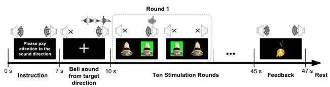 描述实验过程,以视听刺激结合模式举例,实验包括两个sessions,总共40个trials。每个session包含校准subsession及线上分析subsession。校准部分训练出分类器,而线上分析部分则用于评估受试者的声源定位能力。如图二所示:每一次trial中,①首先包含引导部分(7s),提醒受试者注意铃声方位并记录目标刺激的次数;②然后会随机出现目标方位的铃声(3s),引导受试者注意目标方位。③之后就进入刺激部分(35s),共10个rounds,每个round随机出现目标刺激与非目标刺激。同一个round内连续的刺激之间间隙时间不定,但是总能保持一个round持续3.5s,这种方法可以提升受试者的注意力及增强对目标刺激的脑电反应。④之后便是反馈部分(2s),如果受试者具有声源定位的能力,能够正确找到目标刺激,那么他会产生与目标刺激相关的ERPs,训练好的分类器会输出结果。