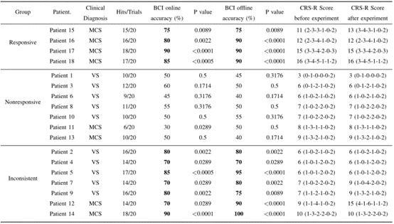 根据实验结果,将P15,P16,P17,P18认定为“有反应型”患者。他们在提出的BCI系统分类准确率及昏迷量表评估中(BCI交互实验之前)都有不错的结果。根据图三、图四得出,他们对于目标刺激和非目标刺激引发的脑电波区别明显,并且大多能检测到负向波MMN及正向波P300。其中一名患者P15虽然未检测到负向波,但是在BCI交互试验后的昏迷量表评估结果有所提升。其他人P16,P17,P18均无变动。