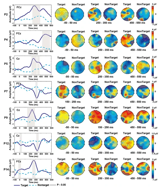 计算每个受试者的ERP波形,分析在目标刺激和非目标刺激下波形的区别。并绘制对应头皮拓扑图。