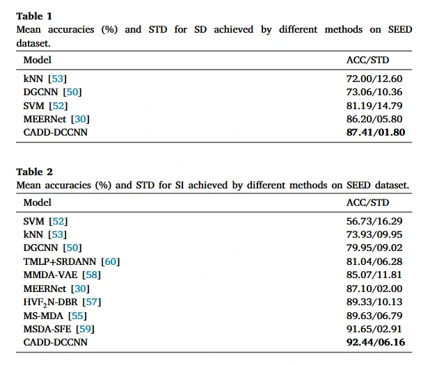 在SEED数据集分别进行了跨被试(SI)实验和跨会话(SD)实验,并与其他方法比较,实验结果见图4。可以看到,本文的CADD-DCCNN在SI任务上,达到92.44%的平均准确率,显著优于现有方法(如MEERNet的87.10%、MS-MDA的89.63%),表明其跨被试泛化能力突出。而在跨会话场景中取得87.41%的准确率,验证了对同一被试不同时间数据的鲁棒性。
