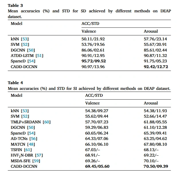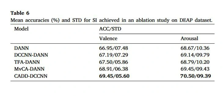 在DEAP数据集上,进行了效价分类的跨被试和跨会话实验,实验结果如图5所示。在跨会话实验中,与其他非域自适应方法相比,唤醒度的平均精度达到了92.42%,优于其他方法,而效价的平均精度也处于较高水平,仅次于sparseD。而在跨被试场景中,效价和唤醒度的平均精度分别为69.45%和70.50%,尽管模型性能在SI场景远低于SD场景,但仍优于同在SI场景下的其他模型。这些结果表明,文章提出的CADD-DCCNN方法在最小化个体内和个体内差异方面具有优势。