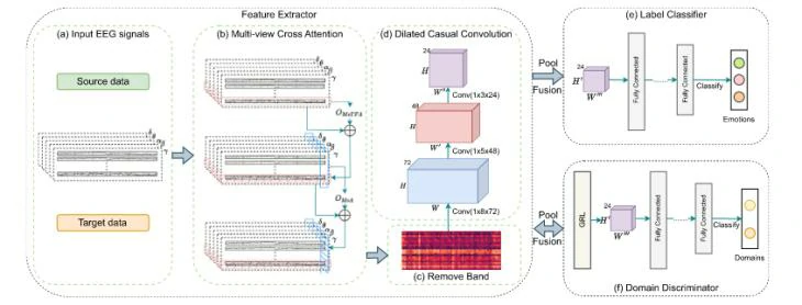 针对上述问题,本文提出一种融合多视图学习与域自适应的新型框架CADD-DCCNN,如图1所示。CADD-DCCNN由五个部分组成,分别是:输入特征表示模块、多视图跨注意力机制模块(MvCA)、扩张因果卷积神经网络(DCCNN)、域鉴别器(Domain Discriminator)和标签分类器,分别对应图1中的a、b、d、e、f。其中,多视图跨注意力机制模块又可细分为多视图时间帧注意力(MvTFA)、和多视图注意力(MvA)。该方法的核心在于多视图跨注意力机制(MoCA)与对抗域适应(Adversarial Domain Adaptation)的协同设计,分别解决个体差异与时空特征选择两大核心挑战,其本质在于动态筛选关键特征并对齐跨域分布,从而实现高效、泛化的情感表征学习。