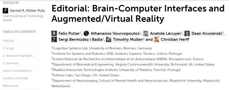 德国不莱梅大学Felix Putze等人在研究现实增强(Augmented Reality , AR)与虚拟现实(Virtual Reality , VR)技术与脑机接口(Brain-Computer Interfaces , BCI)结合的巨大潜力,进一步提高AR/VR的沉浸性,提高BCI在康复和控制方面的可用性。相关成果作为Editorial论文于2020年5月发表在 《Frontiers in Human Neuroscience 》 杂志上。原文题目为Brain-Computer Interfaces and Augmented/Virtual Reality。本文将会对论文中的内容进行介绍以及自己的总结。