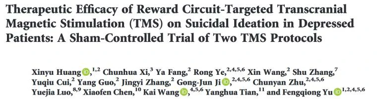 该论文发表于Depression and Anxiety,题目为《Therapeutic Efficacy of Reward Circuit‐Targeted Transcranial Magnetic Stimulation (TMS) on Suicidal Ideation in Depressed Patients: A Sham‐Controlled Trial of Two TMS Protocols》。